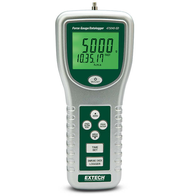 The Extech 475040-SD Digital Force Gauge/Datalogger dates, time stamps, and stores up to 2 M of push/pull readings on an SD card in Excel format for easy transfer to a PC. Featuring a 5 digit LCD display with peak hold, exclusive load cell measurement transducer, and an overrange, low battery, and advanced function indicator. It has 5 kg/176 oz/49 Newtons measurement capacity with 0.5% basic accuracy and auto power off. Complete with SD card, tension rod, carrying case and 4 adapters (flathead, cone, chisel, and hook for tension), and 6 AA batteries.