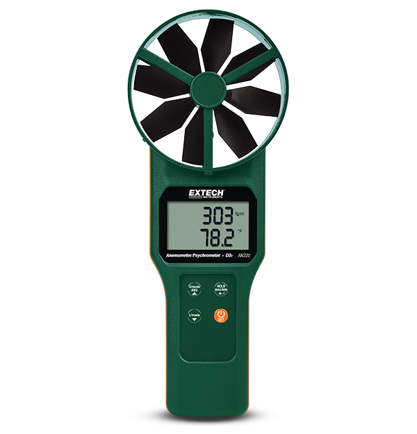 The Extech AN320 is a Large Vane CFM/CMM Anemometer/Psychrometer plus CO2. This meter measures air velocity, air flow, relative humidity, wet bulb, dew point and carbon dioxide. Extech’s Large Vane Thermo-Anemometer series allows for more precise readings on larger size ducts. It includes min/max, data hold, and auto power off functions. Complete with 4 AAA batteries and hard carrying case.