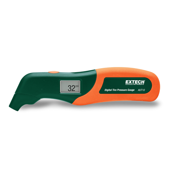 The Extech AUT10 is a Digital Tire Pressure Gauge featuring an illuminated white LED tip that helps locate the valve stem easier with ± (1% +1 PSI) accuracy. It includes a 3.5 digit backlit LCD with auto power off function and two 1.5 V AAA batteries.