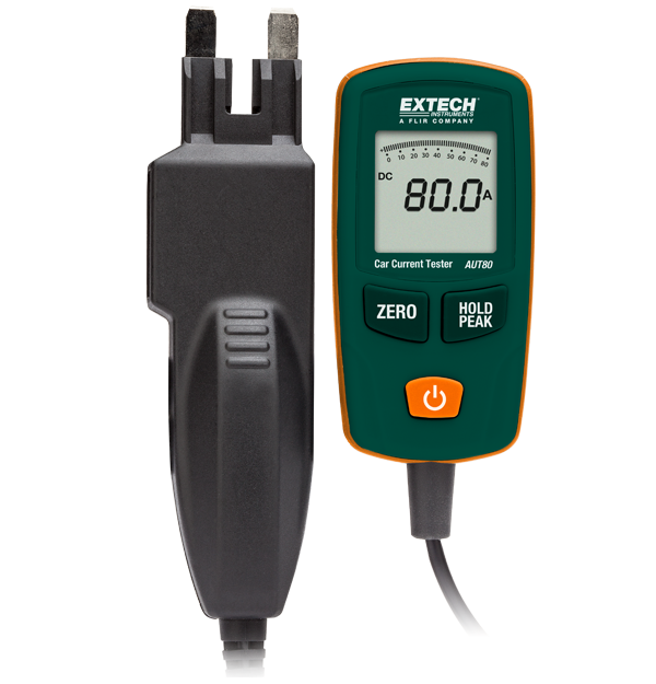 Extech AUT80 可在不断开电路的情况下检测最高 80 A 的电流。最小值、ATC 和最大值刀片连接器可直接插入保险丝盒。它具有 80 A/48 VDC(最长 10 秒)的测量范围,分辨率为 0.1 A,精度为(±2% + 4 位)。结果显示在带条形图的 3.5 位液晶显示屏上。含一节 9 V 电池。