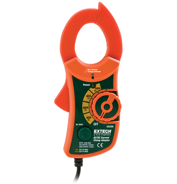 The Extech CA250 is a 400 A AC/DC Clamp-on Adaptor with built in NCV that can be used with any multimeter with a 1 mV input and accepts standard banana plugs. It has a 30 mm (1.2 in) clamp jaw and 2.5% accuracy. Additional features include a built in, non-contact voltage detector with LED alerts and a DC zero adjust. Comes complete with built in 1.1 m (3.8 ft) cable with banana plugs and two AAA batteries.