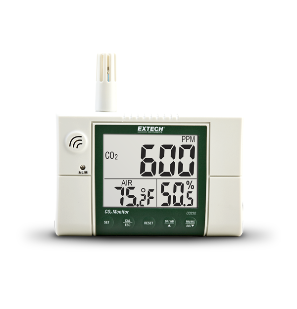 Extech CO230 可测量二氧化碳 (CO₂)、空气温度和湿度。具有自动基线校准 (ABC) 功能(带禁用),可用于 CO₂ 浓度持续升高的区域。其警报功能具有用户可设置的高/低 CO₂ 水平,非常适合监测空气质量并确保会议室、学校、温室、工厂、酒店、医院和其他任何可产生高二氧化碳浓度的地方保持适当的通风。CO230 还可计算露点和湿球温度值、调用最小/最大 CO₂ 值,以及统计 TWA(八小时时间加权平均值)和 STEL(15 分钟短期暴露限值)的加权平均值。通风控制用警报继电器输出和墙装基座。配有通用交流适配器和多种类型的插头(美国、欧盟、英国、澳大利亚)。