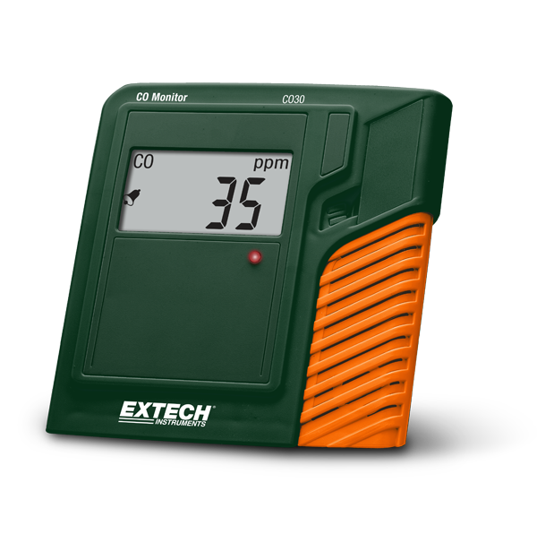 The Extech CO30 displays carbon monoxide (CO) concentration, air temperature, and relative humidity. It features a programmable audible alarm with a high decibel beeper which sounds when CO concentration rises to unsafe levels. The unit can be wall mounted or used on a desktop close to areas of concern. Other features include a visible bright tri-colored (green, yellow, red) LED alarm indicator, a zero re-calibration function, manual temperature and relative humidity compensation (adjustable), CO calibration function in fresh air, and a low battery indicator. Complete with universal AC adaptor (including US, EU, UK, and AU plugs), and four AAA batteries.