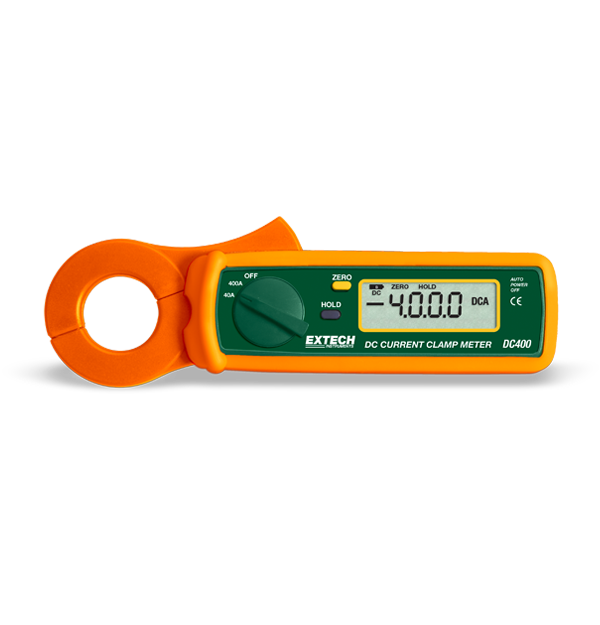 The Extech DC400 is a 400 A DC Mini Clamp Meter with high accuracy and resolution. It measures up to 400 A DC in 2 ranges with one touch and comes with functions such as auto zero, auto power off, and data hold. Complete with rubber holster, wrist strap, belt holster, and 9 V battery.