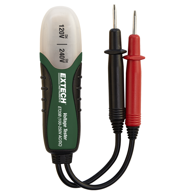 Extech ET20B 是一款尺寸紧凑的交流/直流电压笔(100-250 V 交流/直流)。它配有氖灯电压指示器、内置测试引线、便携式夹子和绝缘外壳。