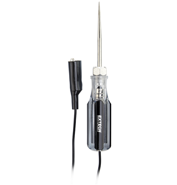 The Extech ET40B is a compact size Continuity Tester with a built in, 73 mm (2.9 in), stainless steel probe. It is capable of detecting open circuits in fuses, diodes, switches, and wires. Comes with an insulated alligator clip and one AAA battery.