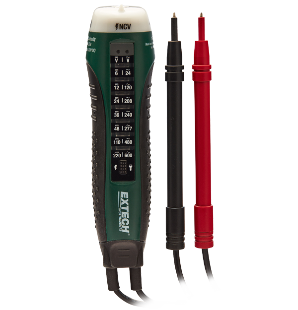 这款易用的电压测试仪配有 7 挡 LED 指示灯,可快速显示所测量的交流和直流电压的范围。当检测到电压 >85 V 时,该仪表会振动。其内置的非接触式电压笔功能可轻松检测 90 至 1000 V(交流)的带电电压。交流的频率带宽为 45 至 66 Hz。其功能包括用声光警报指示导通性。采用明亮的内置照明灯和坚固的双模塑外壳设计,集成了测试引线。
