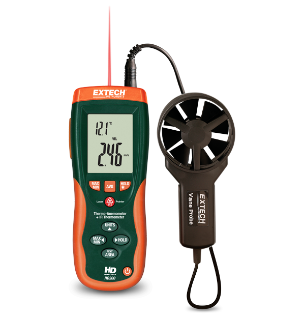 The Extech HD300 is a Thermo-Anemometer with an Infrared Thermometer that measures remote surface temperatures to 500°C (932°F) with a 30:1 distance to target ratio and laser pointer. It can simultaneously display air flow in CFM/CMM or air velocity, plus ambient temperature. This meter has easy to set area dimensions that are stored in the meter's internal memory for the next power on. Additional features include a 9999 count LCD backlit display, 20 point average for airflow, and a heavy duty rugged double molded housing. Comes complete with a vane sensor with 120 cm (3.9 ft) cable, software with cable, carrying case, and 9 V battery.