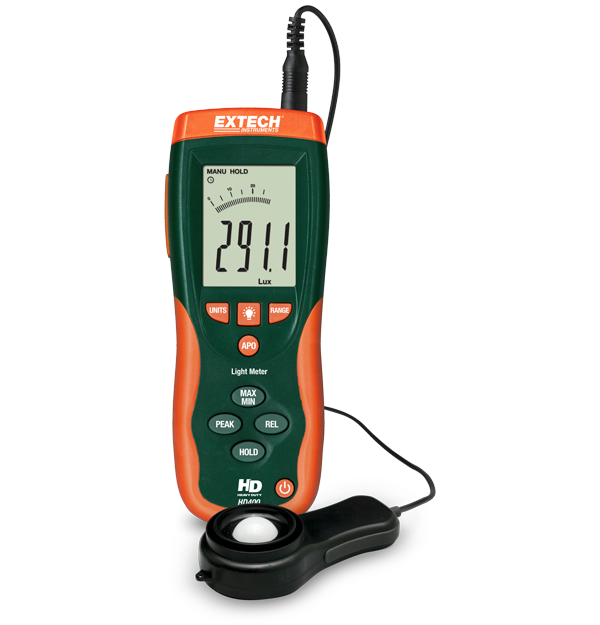 The HD400 Heavy Duty Light Meter measures up to 400 kLux (40,000 Fc) with 0.1 Lux (0.01 Fc) resolution. It features a 5% accuracy, peak mode (10 µs), relative mode, min/max, and data hold functions. The HD400 has a backlit LCD display with a 40 segment bar graph and a rugged double molded housing. Comes complete with light sensor with 1 m (3ft) cable and protective cover, software with USB cable, hard carrying case, and 9 V battery.