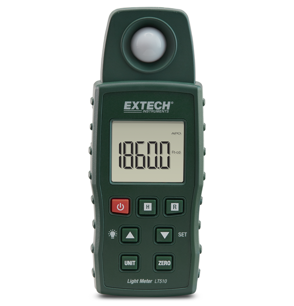 The Extech LT510 measures light intensity up to 20,000 Lux (1860 Foot-candles) with resolution to 1 Lux/0.1 Fc. Ideal for indoor lighting tests and for checking security and safety illumination in parking garages, night time ATM areas, stairwells, landings, and hallways.