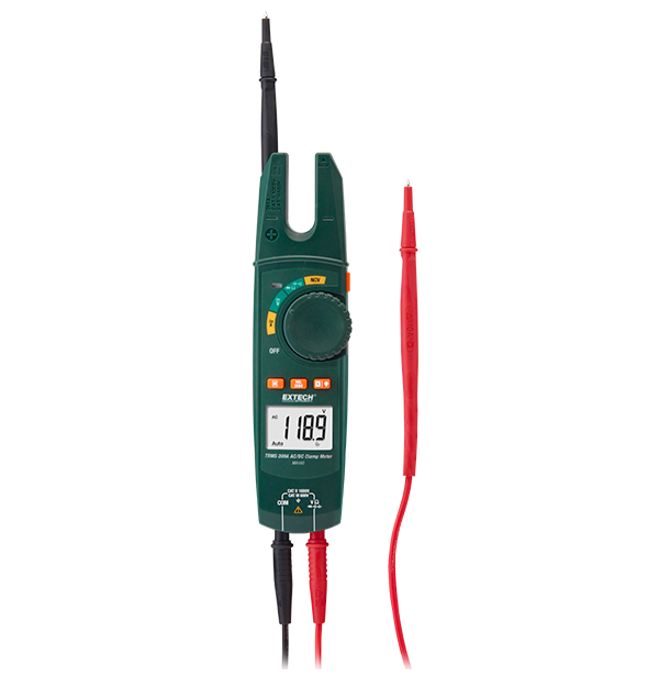 The Extech MA160 is an open jaw True RMS 200 A AC/DC Clamp Meter. Its open jaw design provides quick current measurements in tight locations without breaking the circuit. True RMS provides accurate readings on noisy, distorted, or non-sinusoidal waveforms. The convenient built in non contact voltage (NCV) detector allows quick detection of live voltages while the LED backlight and flashlight help take measurements in dimly lit environments. The MA160 also features AC voltage to 750 V, DC voltage to 1000 V, resistance, capacitance, continuity, and diode test as well as an auto power off and ergonomic housing with built in test lead holders. Complete with test leads, two AA batteries, and pouch.