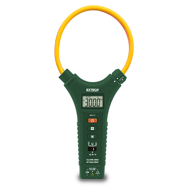 Extech MA3110 是一款 3000A 真有效值交流柔性钳形表。28 cm 的钳口可轻松将母线和电缆束包住,而普通钳口则可能难以操作。8 mm 的细径电缆可轻松放入狭小空间。包括万用表用于测量电压、电阻和电容的测试引线。真有效值和 CAT IV 级可保证测量的准确与安全。