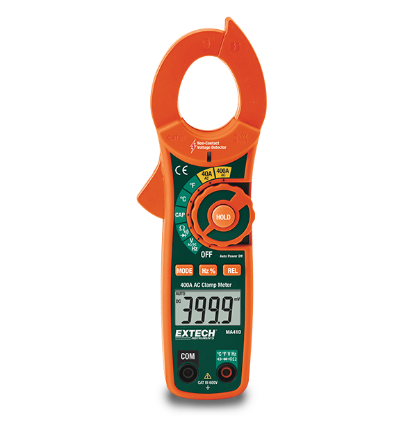 外形紧凑的 Extech MA410 400 A 真有效值钳形表是提供给工厂维护技术人员、电气承包商、空调暖通故障排除人员和发烧友的一款功能先进、价格实惠的测试仪器。除了各种万用表和电流测量核心功能外,该仪表还内置了非接触式电压笔。MA410 的核心是一个全功能数字万用表。测量功能涵盖了非侵入性电流探头测量以外的大多数类型的故障排除。包括电压、电阻、电容、频率、占空比、二极管和导通性测试。甚至还包括使用随附的细珠 K 型热电偶探头测量温度。配有测试引线、通用细珠 K 型热电偶探头、两节 AAA 电池、便携箱、用户手册和一年有限保修。