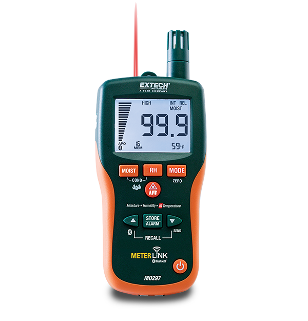 The Extech MO297 is an 8 in 1 Pinless Moisture Psychrometer with a built in infrared (IR) thermometer and Bluetooth MeterLink™ transmitter. It can wirelessly transmits moisture and humidity data to select FLIR thermal imaging IR cameras to incorporate meter readings with thermal images. The pinless moisture sensor allows users to measure moisture in various types of wood and building materials with virtually no surface damage. A remote pin-type probe can be used for contact moisture readings in hard to reach or hazardous areas. Complete with the pin probe cable, 9 V battery, and a case.