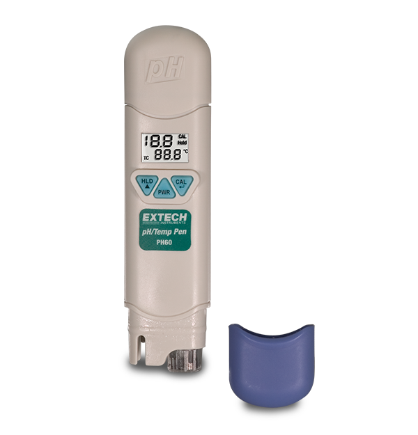 The Extech PH60 Waterproof pH Pen With Temperature has a pH range of 0 pH to 14 pH, as well as a temperature range of 0°C to 50°C (32°F to 122°F). It has a dual LCD screen that displays both pH and temperature readings. This meter has automatic temperature compensation, low battery indication, and an auto power off function. It is easy to calibrate a single CAL key with the automatic pH buffer recognition (4 pH, 7 pH, and 10 pH). The user has a choice of 3 point calibration for better accuracy. Also, this meter has a data hold feature that freezes the readings on the display. The PH60 comes complete with the built in electrode, sensor cap, inner pH electrode protection cap, and four LR44 button batteries.