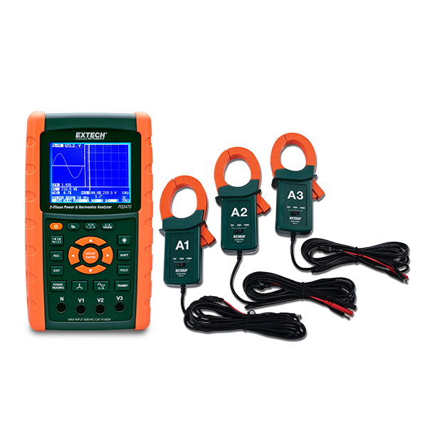 The Extech PQ3470-12 is a 3-phase graphical power and harmonics analyzer/datalogger capable of logging up to 30,000 sets of measurements on a removable SD memory card. The meter features a 3-phase voltage or current unbalanced ratio (VUR, AUR) and unbalanced factor, a wide sampling rate range (2 seconds to 2 hours), and a built in clock and calendar. It is capable of capturing transient events such as dip, swell, and outage with programmable threshold (%). Complete with 4 voltage leads with alligator clips, 8 AA batteries, SD card, 100 V - 240 V AC adaptor, three 1200 A current probes, and a case.