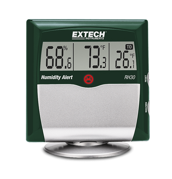 The Extech RH30 Hygro-Thermometer simultaneously measures and displays temperature, relative humidity, and dew point. It allows building managers and homeowners to monitor moisture content in the air in order to prevent mold growth. For mold that thrives in moist conditions and may be found in damp basements, closets, bathrooms, food storage areas, and other interior locations. Comes with desktop stand, two AA batteries, and user manual.