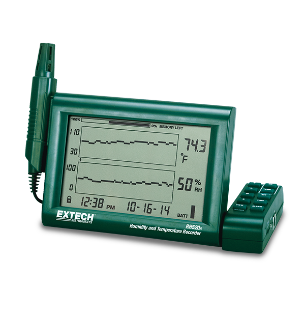 The Extech RH520A-220 is a paperless chart recorder that provides simultaneous digital and graphical display of relative humidity and temperature. The display also shows dew point, date and time and min/max measurements. Stored readings can be recalled on the display or downloaded to a PC to obtain a permanent record. Provisions for wall mounting or the control panel swivels to act as a desk stand. The user can set audible and visual alarms with high and low limits for humidity and temperature. ExChart software calculates wet bulb and grains per pound (GPP). Comes complete with detachable sensor probe with 1 meter cable, RS-232 cable with USB adapter, Windows-compatible software, 220 VAC adapter, and three AA batteries.