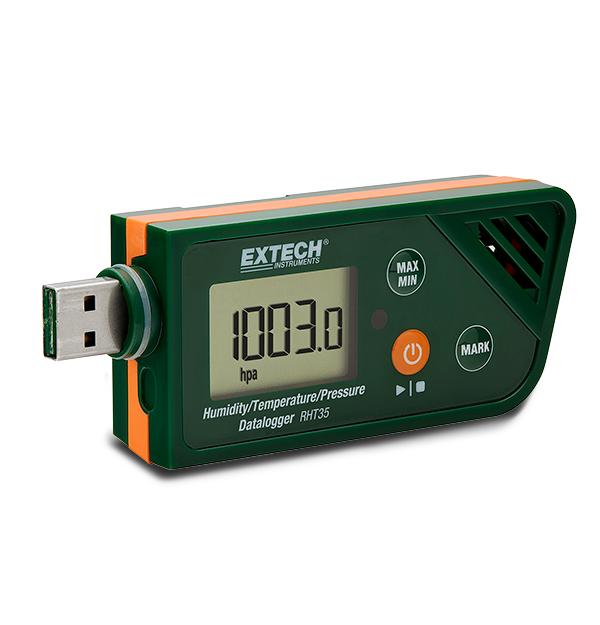 The Extech RHT35 Datalogger uses a standard USB connection to transfer up to 48,000 readings to a PC with a data and time stamp in PDF or in a spreadsheet format. Additional features include an 8 location logger bookmark, 6 language options, programmable sampling interval, an adjustable alarm, and a password protected security login. The large LCD optimizes viewing, and the smart LED provides color-coded humidity, temperature, and barometric pressure reading status.